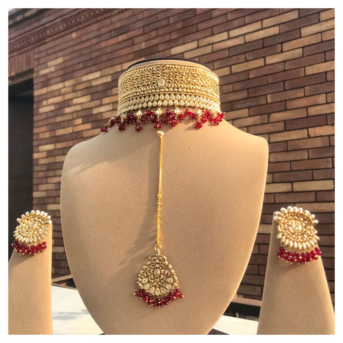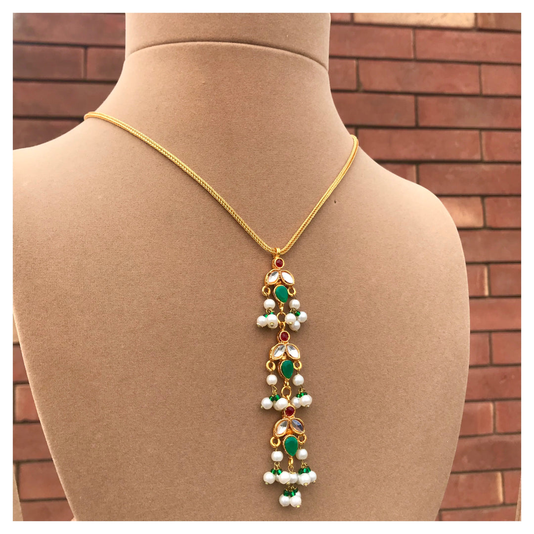 Pearl Necklace with a Kundun Motif & touch of Red & Green beads Brass base with Gold Plating