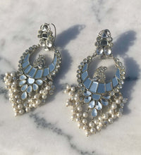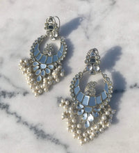 Exclusive chandbali style silver jhumkay with delicate sheesha work, complimented with pearl hangings